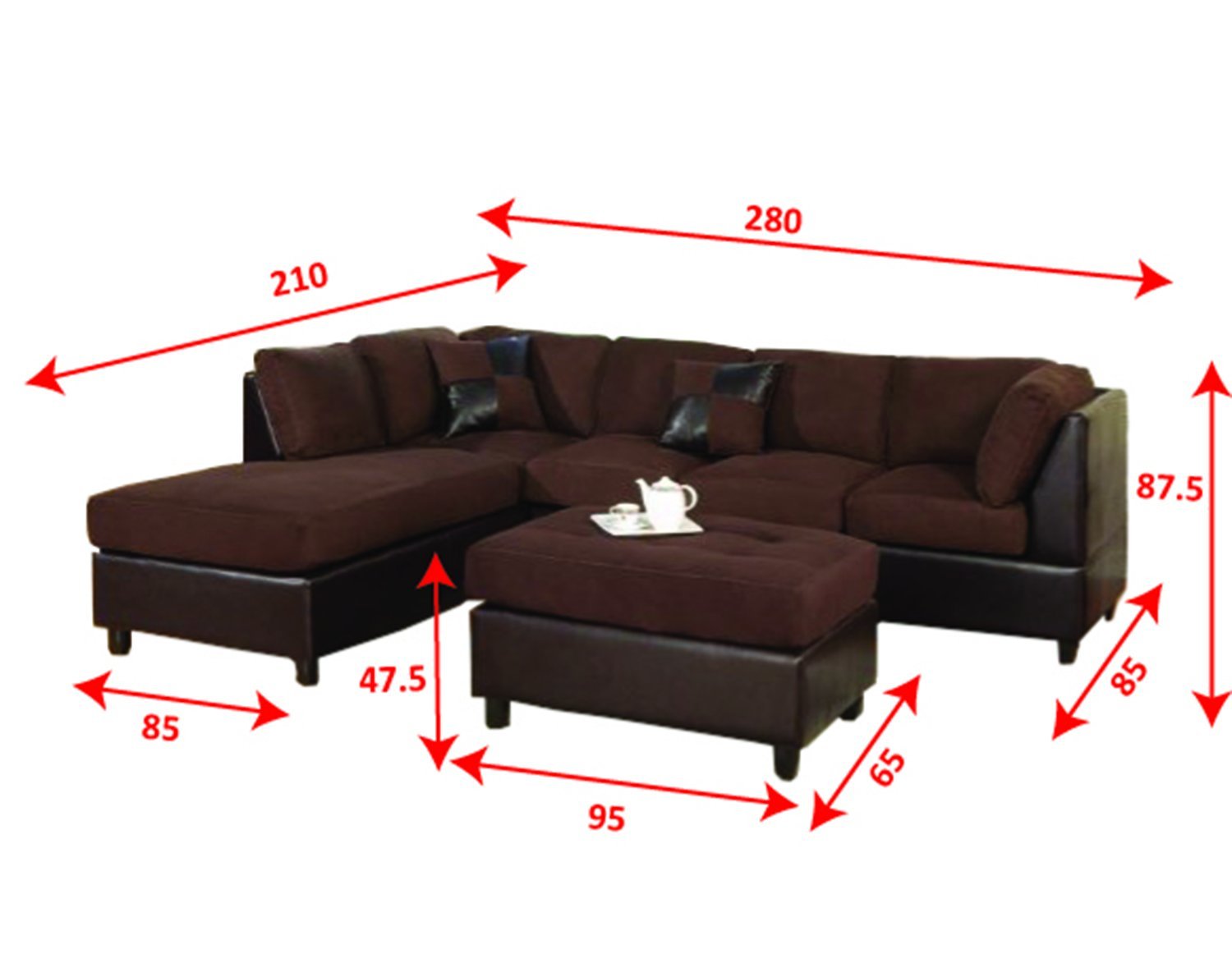 - Spacious 3-piece sectional sofa with L/R-reversible chaise, 3-person sofa, and oversized 38-by-26-inch ottoman, with 2 accent pillows. Ottoman is in space-saving packag