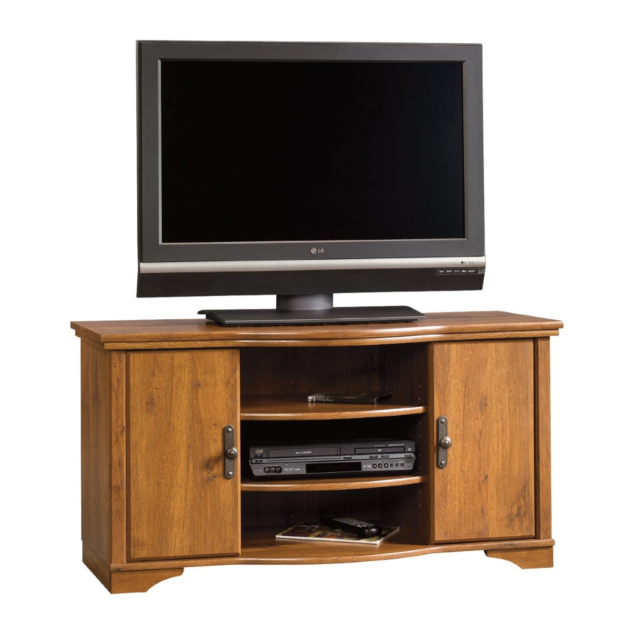 Sophisticated hardware decorates the doors and the cabinetry design has the feel of handcrafted Americana. Storage solutions available for your audio/video equipment, CD's and DVD's. The solid wood detailing is the perfect touch to the golden tones of the Abbey Oak finish.